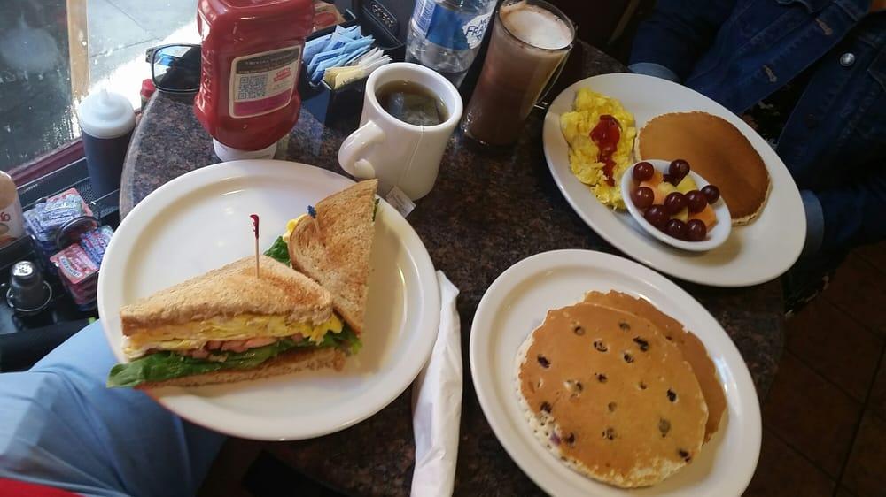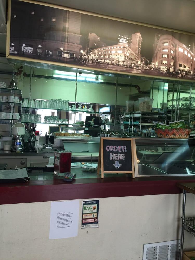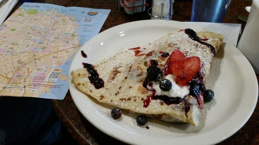 We went here this am and I have to say, not bad at all. First it was a clean place, located in a nice area, fast service, etc. we walked right in on a Tuesday morning and got right in and got two tables. The food is a bit pricy but what do you expect for union square? For what we paid and serving 5 people for $61 I am not disappointed, it was expected. The food was good, I would go back. I had the crepe with brown surgar, was not bad. My daughters had the ham and cheese crepe and I had a bit of those as well, good. I would go back no question. For staying at the Marriott on Powell and Sutter st it was literally just walk out the door and across the street, perfect.